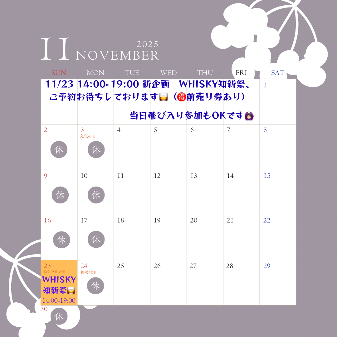 2025年11月営業日カレンダーです。皆様のご来店、お待ちしております。