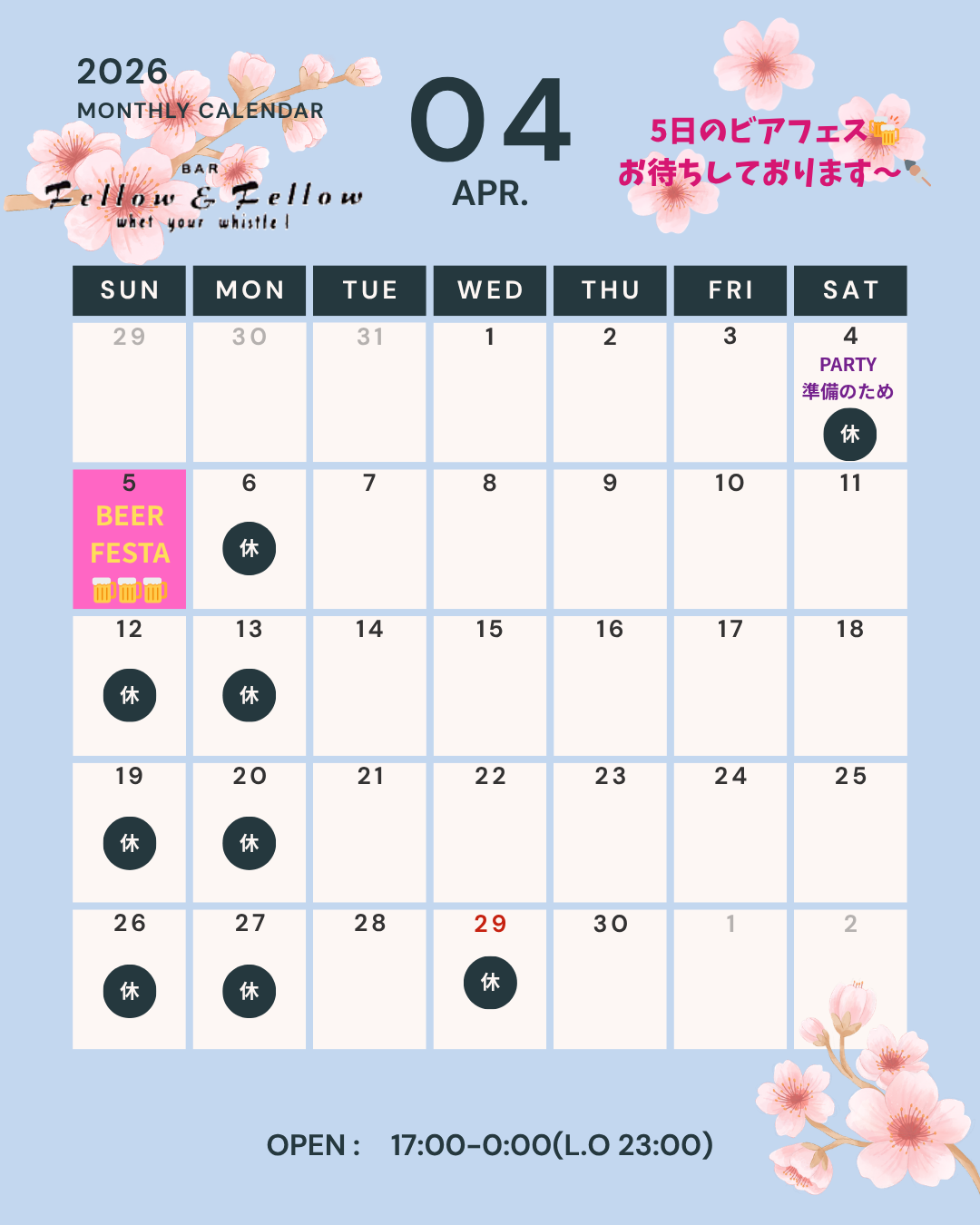 4月の営業日カレンダーです。皆様のご来店お待ちしております。